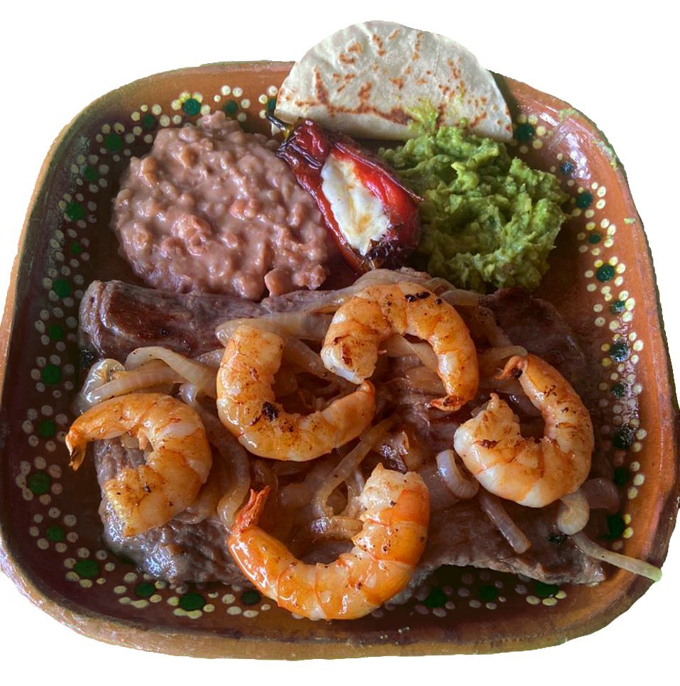 Disfrute de la combinacion del sabor del mar y de una buena arrachera en su paladar corte de carne con sus camarones, frijoles guacamole, quesadilla, deguste nuestros comensales.
